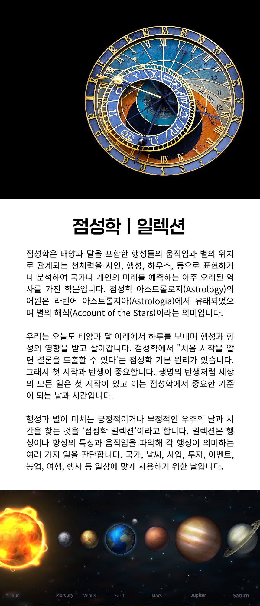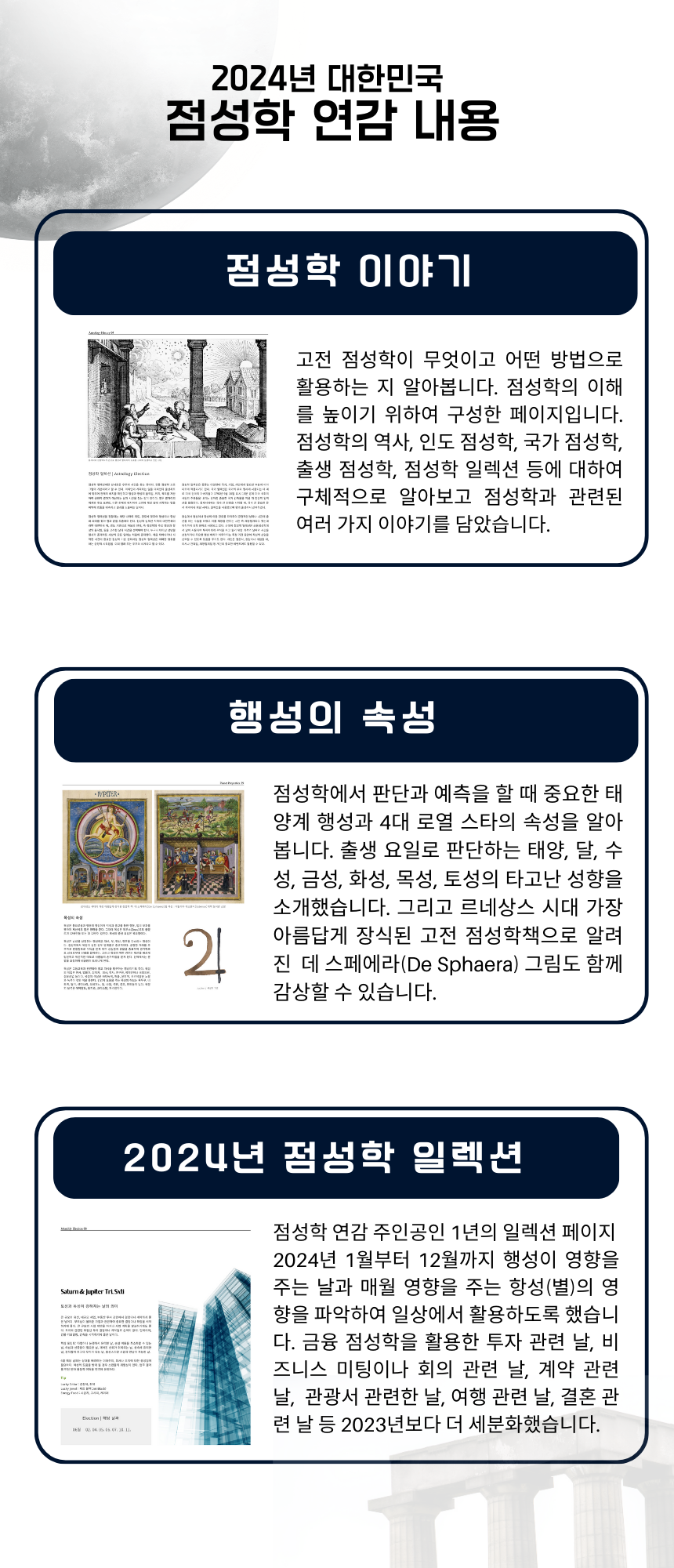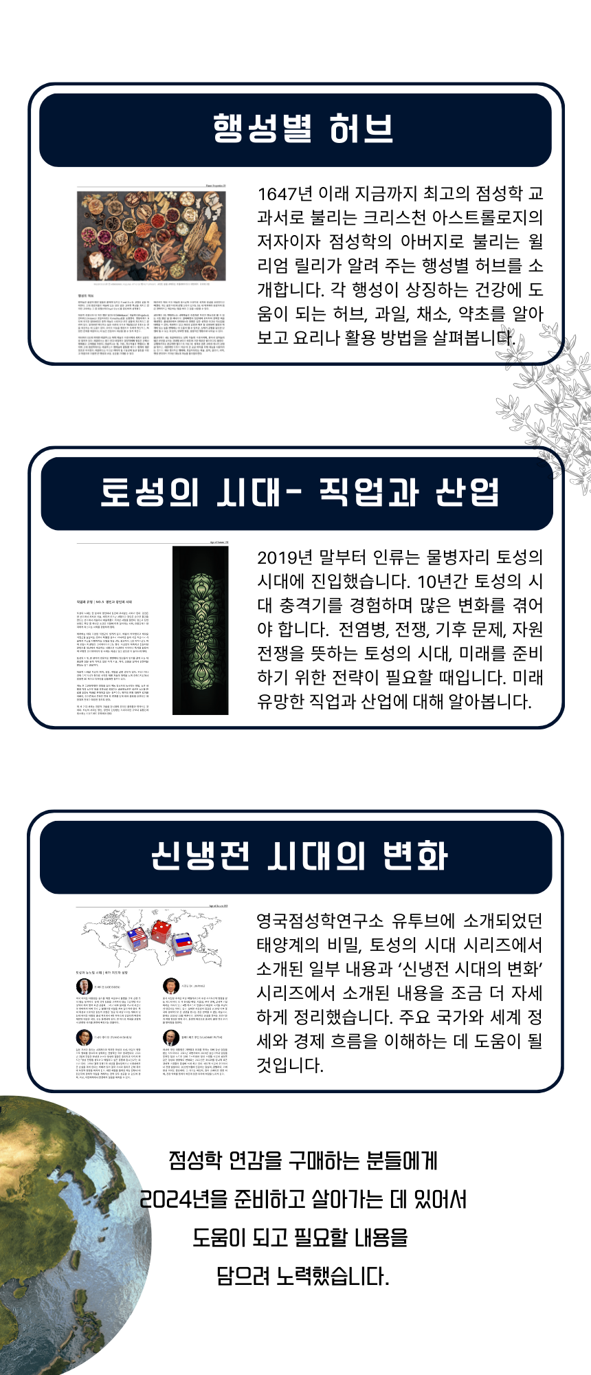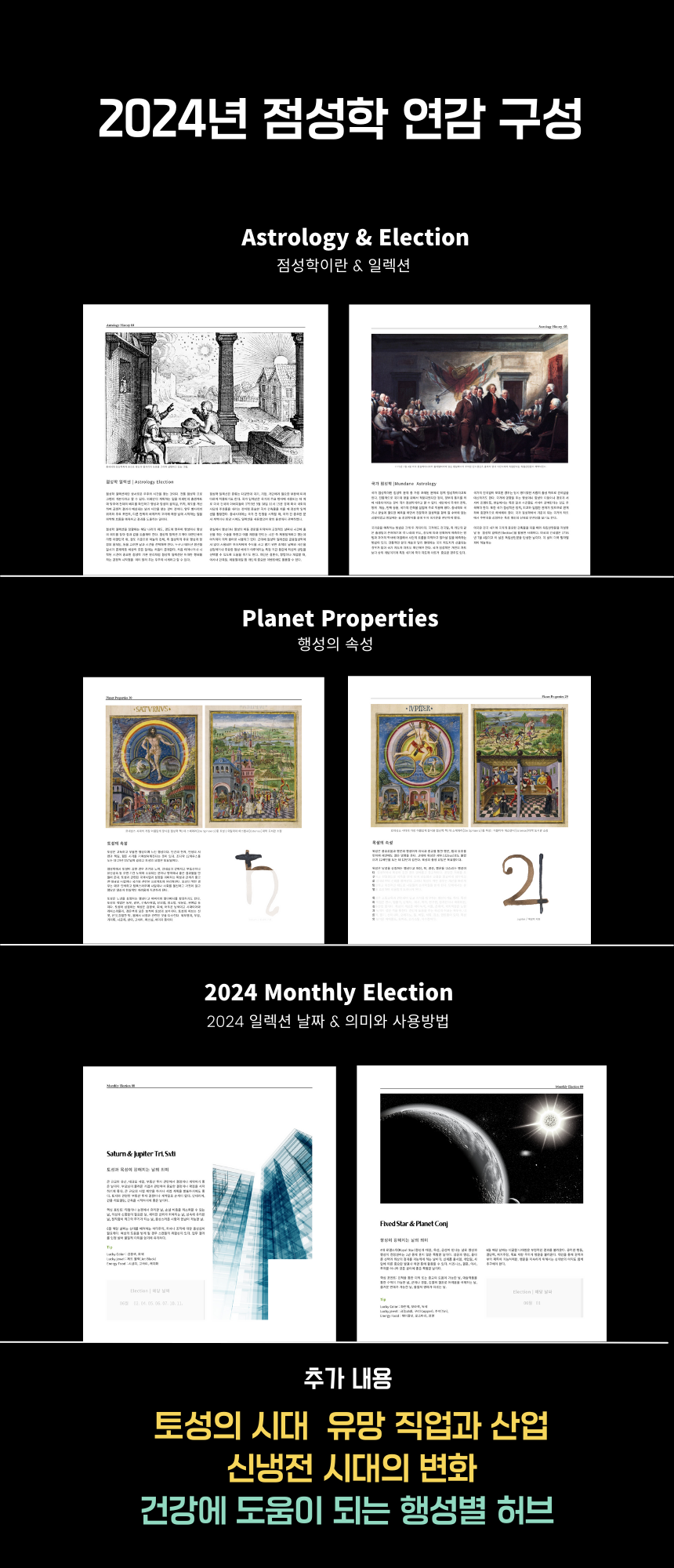 Part 1. 점성학 이야기 Part 2. 수호 행성별 매월 운세 Part 3. 점성학 일렉션 Part 4. 행성별 허브(고전 점성학) Part 5. 국가점성학으로 본 세계 정세 Part 6. 토성의 시대 (건축,농업,영성에 대하여)