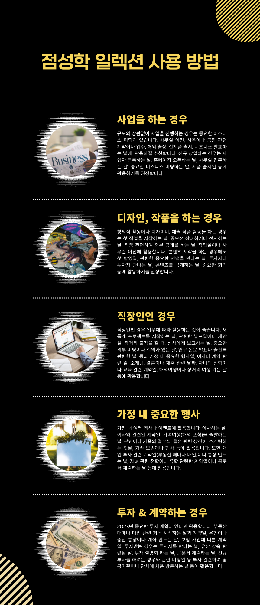 2024년 1년 동안 대한민국에 영향을 주는 행성과 별의 이동 경로를 파악하여 좋은 날과 행운의 날, 부정적인 날과 피해야 하는 날을 구분하여 실생활에 활용할 수 있게 만들었습니다. 대한민국 위. 경도를 기준으로 제작되어 대한민국에서 일어나는 모든 이벤트에 적용할 수 있습니다. 결혼이나 이사, 여행 등 가족 행사나 매장 오픈 날짜, 사무실 이전, 계약 날짜, 사업자 신고일 등 비즈니스에도 요긴하게 사용할 수 있습니다.