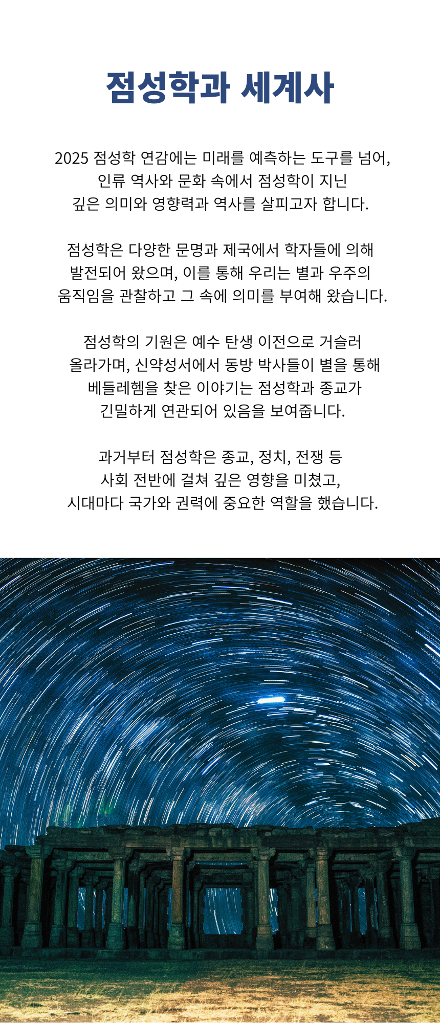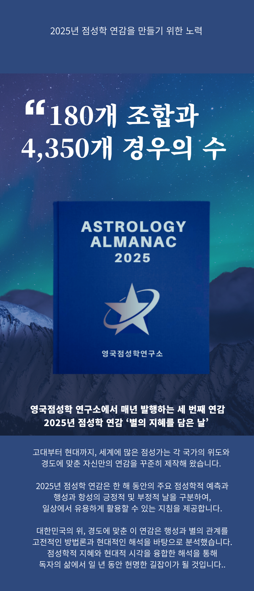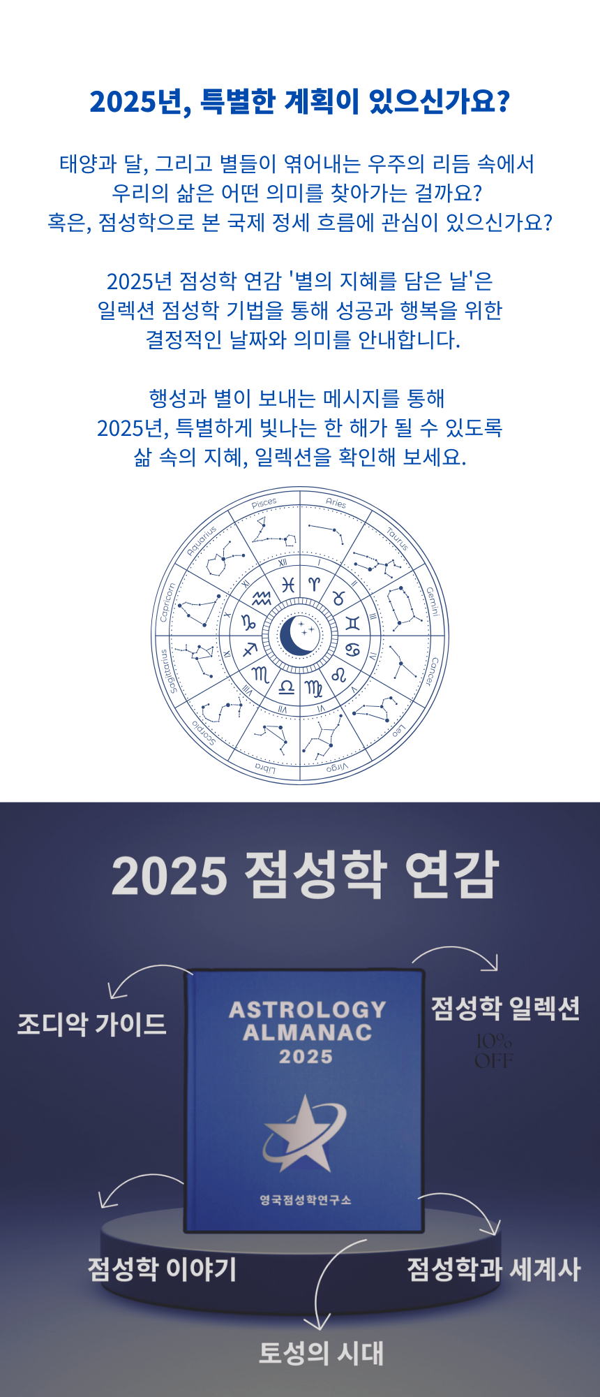 2025 대한민국 점성학 연감 – "별의 지혜를 담은 날" 인쇄한 연감은 모두 품절 되었습니다. 미처 구매하지 못하신 분은 PDF파일로 구매해 주시기 바랍니다.