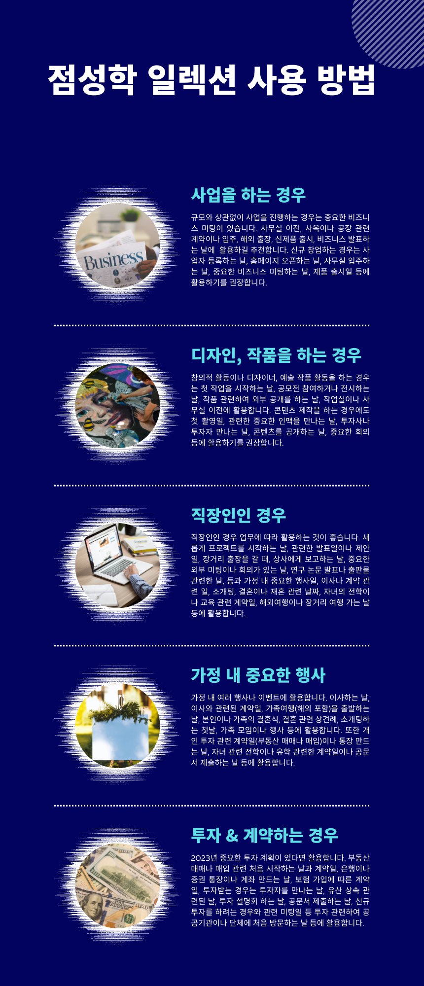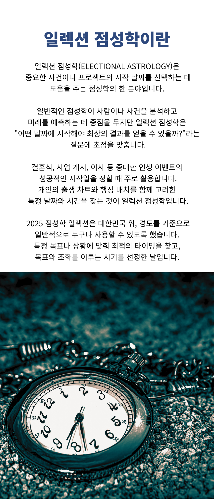점성학을 모르는 일반인도 결혼, 이사, 여행 같은 가족 행사부터 개업, 사무실 이전, 부동산 계약 등 사업 일정에 유용하게 활용할 수 있습니다. ‘일렉션 점성학’은 특정 순간이 지닌 에너지가 이후 결과에 영향을 미친다고 보는 점성학 분야로, 첫 탄생, 첫 통화, 첫 메일 전송, 신규 프로젝트 시작, 계약서 서명 등 중요한 순간에서 그 가치를 발휘합니다.
