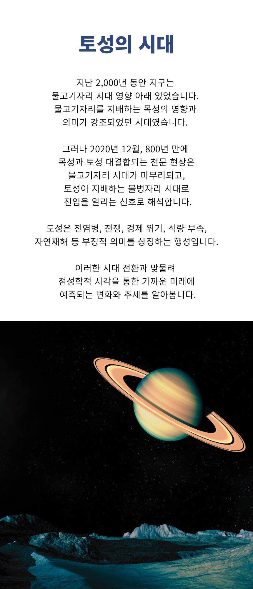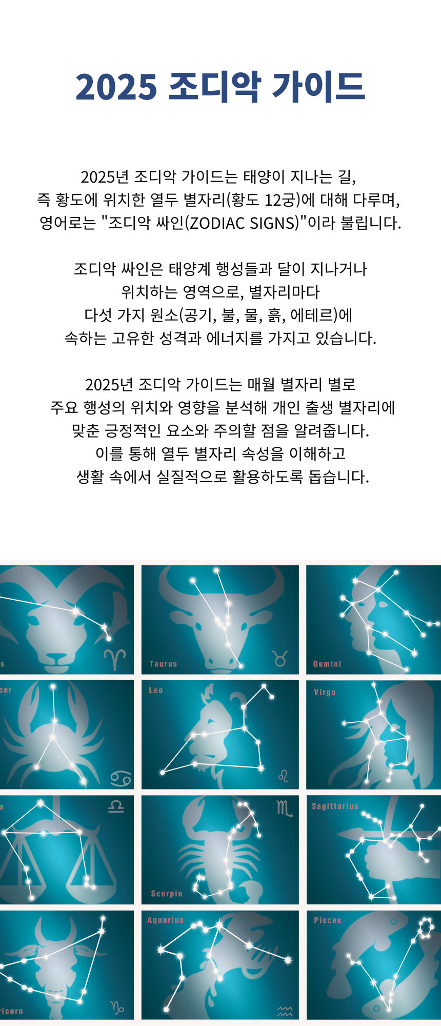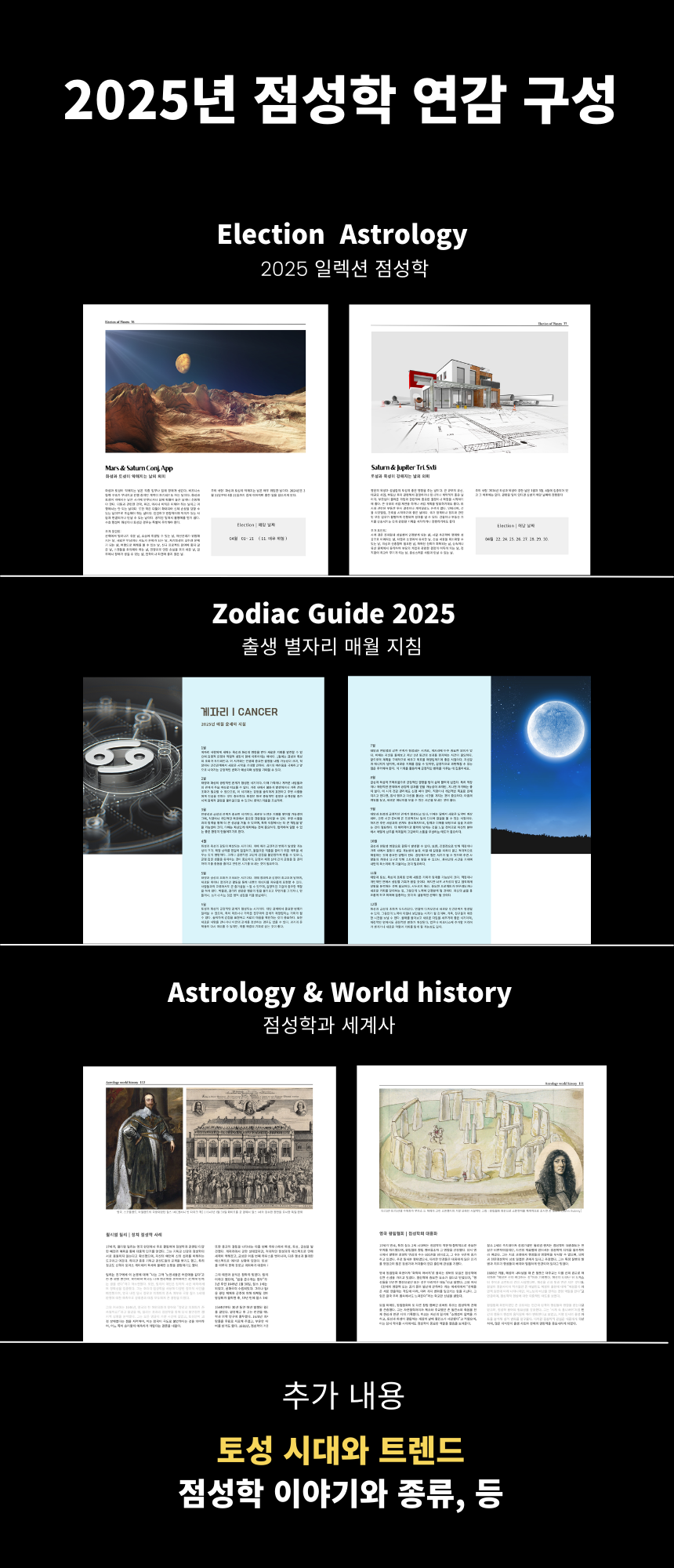 연감 구성 내용 • Part 1. 점성학 이야기 • Part 2. 2025년 별자리 매월 가이드 • Part 3. 점성학 일렉션 2025 • Part 4. 점성학 이야기와 활용법 • Part 5. 점성학과 세계사 • Part 6. 토성의 시대 (국가 정세와 트렌드)