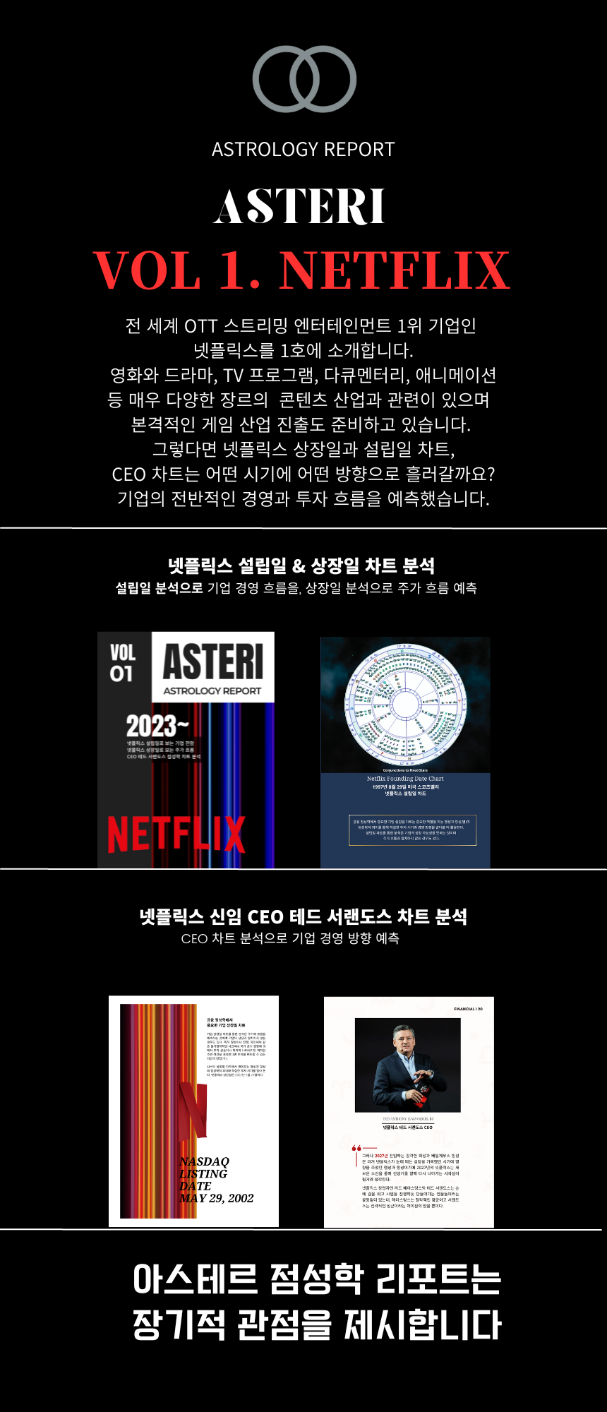 점성학 리포트 "아스테르 1호 주제"는 넷플렉스입니다. 전 세계 OTT 스트리밍 1위 그룹 넷플릭스의 기업 차트를 분석하여 정리했습니다. 넷플릭스 설립일로 기업 성장 전망을 판단하였고 상장일로 주가 흐름과 리스크를 판단하였으며 CEO 테드 서랜도스 차트 분석으로 경영 방향을 예측했습니다.