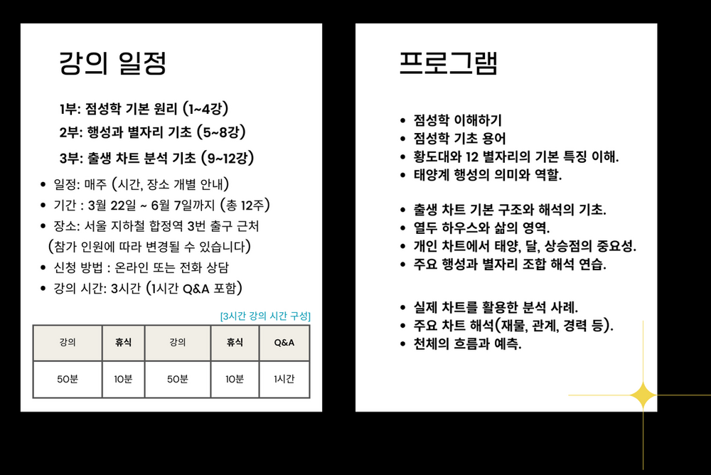 별들의 언어를 해석하는 법을 배우고, 나만의 차트를 알아 보세요. 소그룹 강의로 선착순 마감합니다.