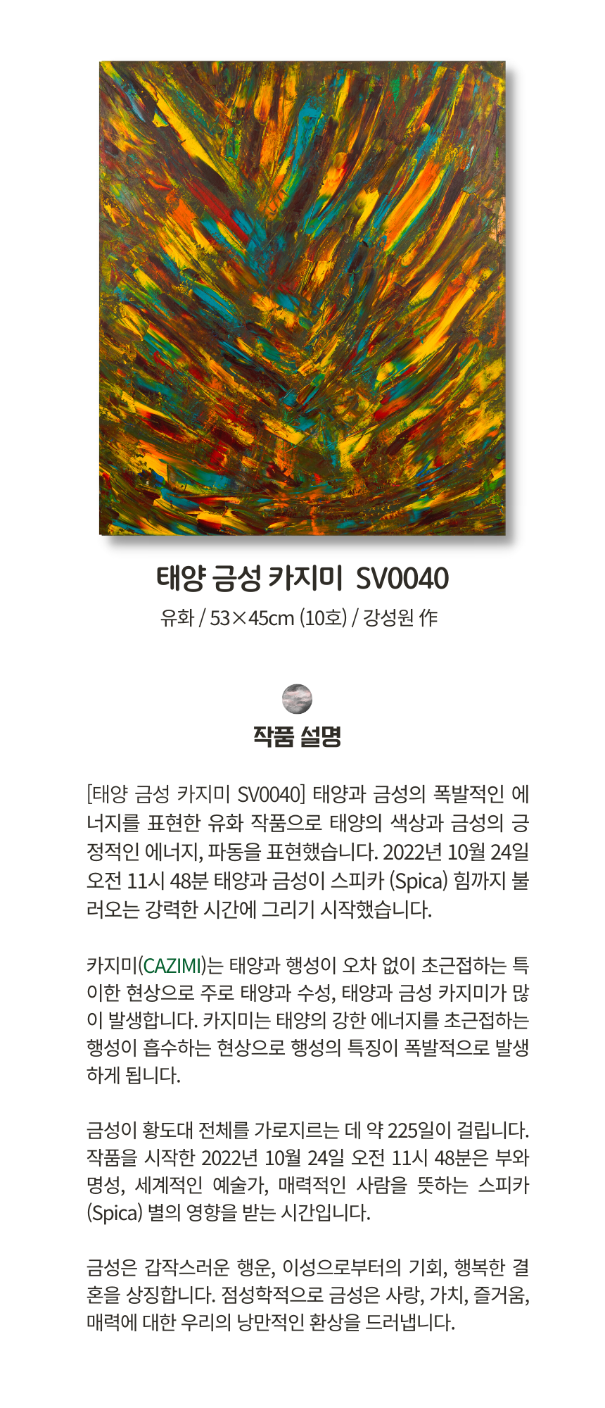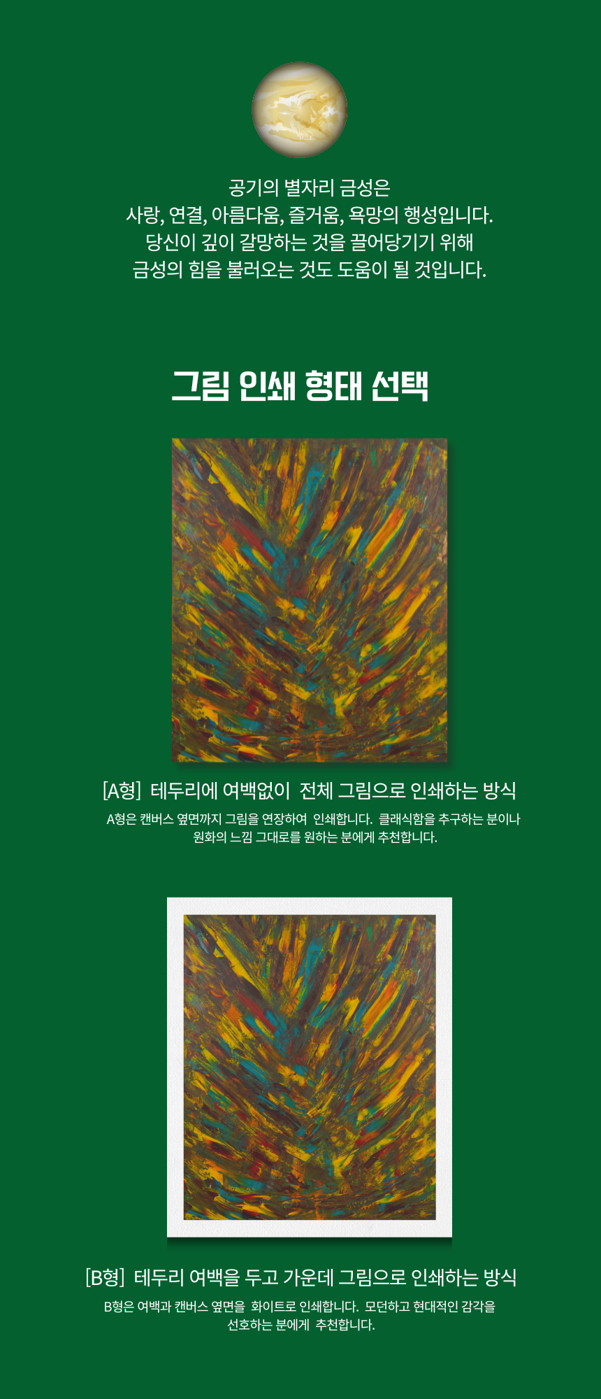 영국점성학연구소 강성원 소장이 직접 그린 그림을 캔버스에 인쇄하는 주문 제작 상품입니다. 태양과 금성이 카지미하는 긍정적인 영향을 주는 시간에 그린 그림으로 캔버스 액자 뒷면에 소유자에게 도움이 되는 보호부 인장을 직접 그려 보냅니다.
