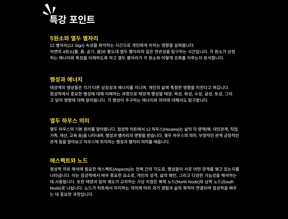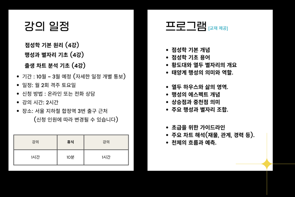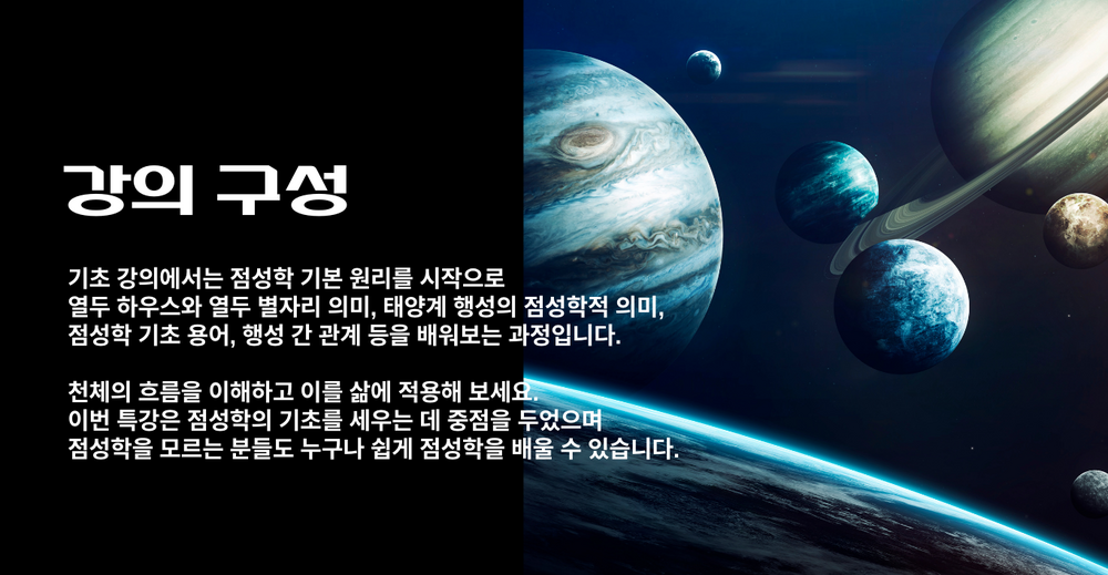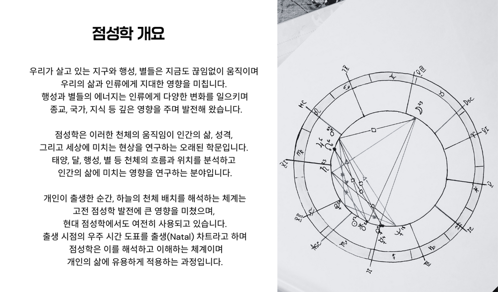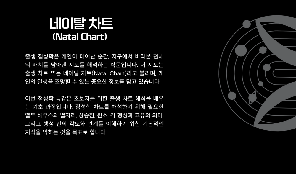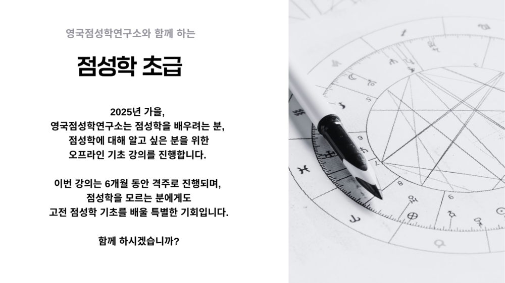 점성학을 처음 접하는 분들을 위한 출생 점성학 기초 과정을 소개합니다. 별들의 언어를 해석하는 법을 배우고, 나만의 차트를 알아 보세요. 소그룹 강의로 진행되며 교재는 제공합니다.