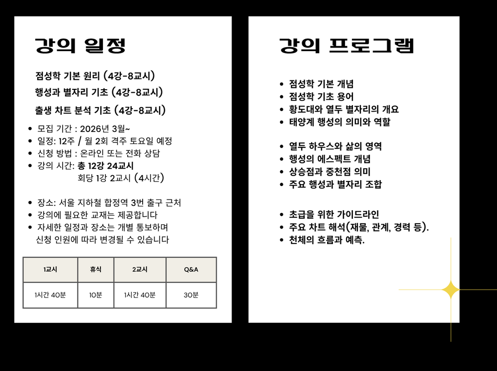 점성학을 처음 접하는 분들을 위한 출생 점성학 기초 과정을 소개합니다. 별들의 언어를 해석하는 법을 배우고, 출생 차트를 알아 보세요. 소그룹 강의로 진행되며 필요한 교재는 제공합니다.