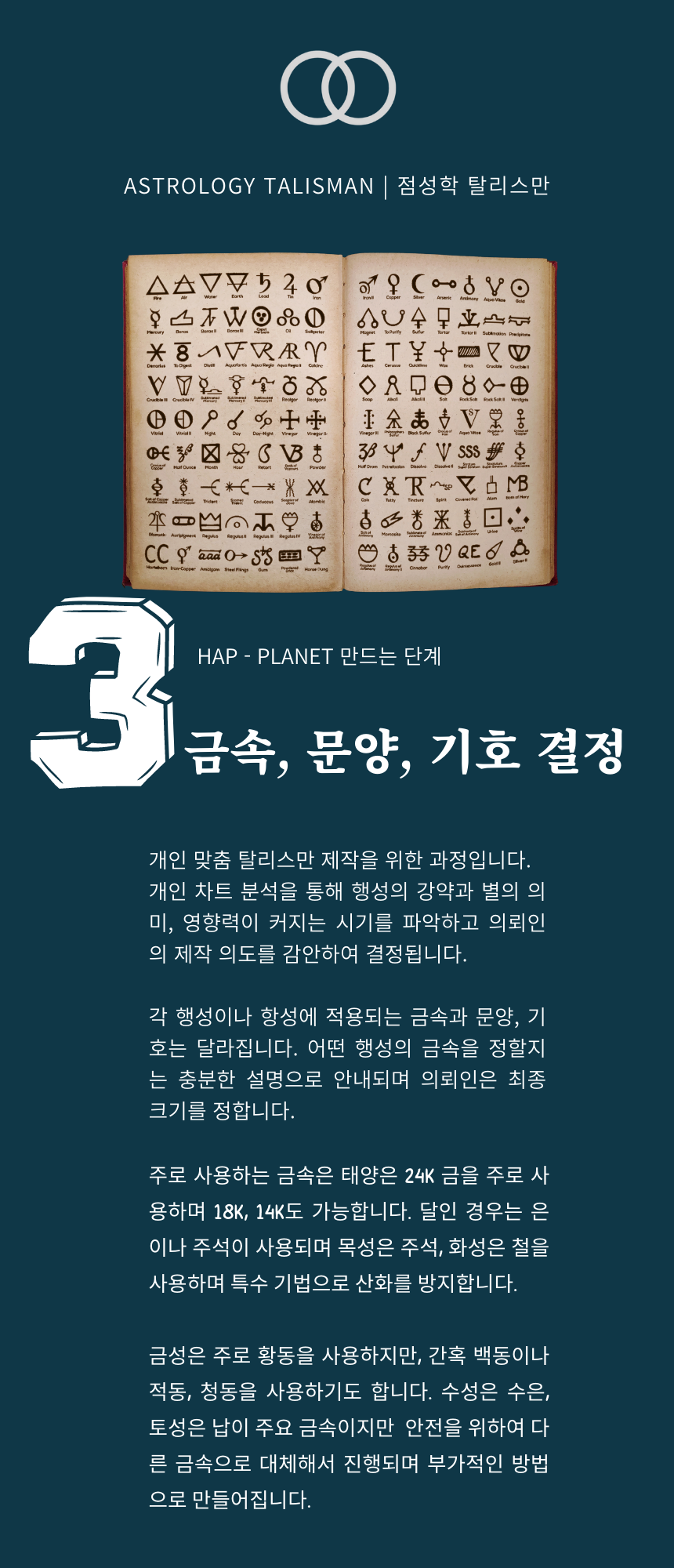 1. 금속 가격 (주문 당일 시세 적용) : 순금, 18k, 14k의 경우 탈리스만 각인이 가능하면서 변형되지 않는 최소 중량이 7돈입니다. 은, 구리, 주석, 철은 탈리스만 크기에 따라 중량이 달라집니다.