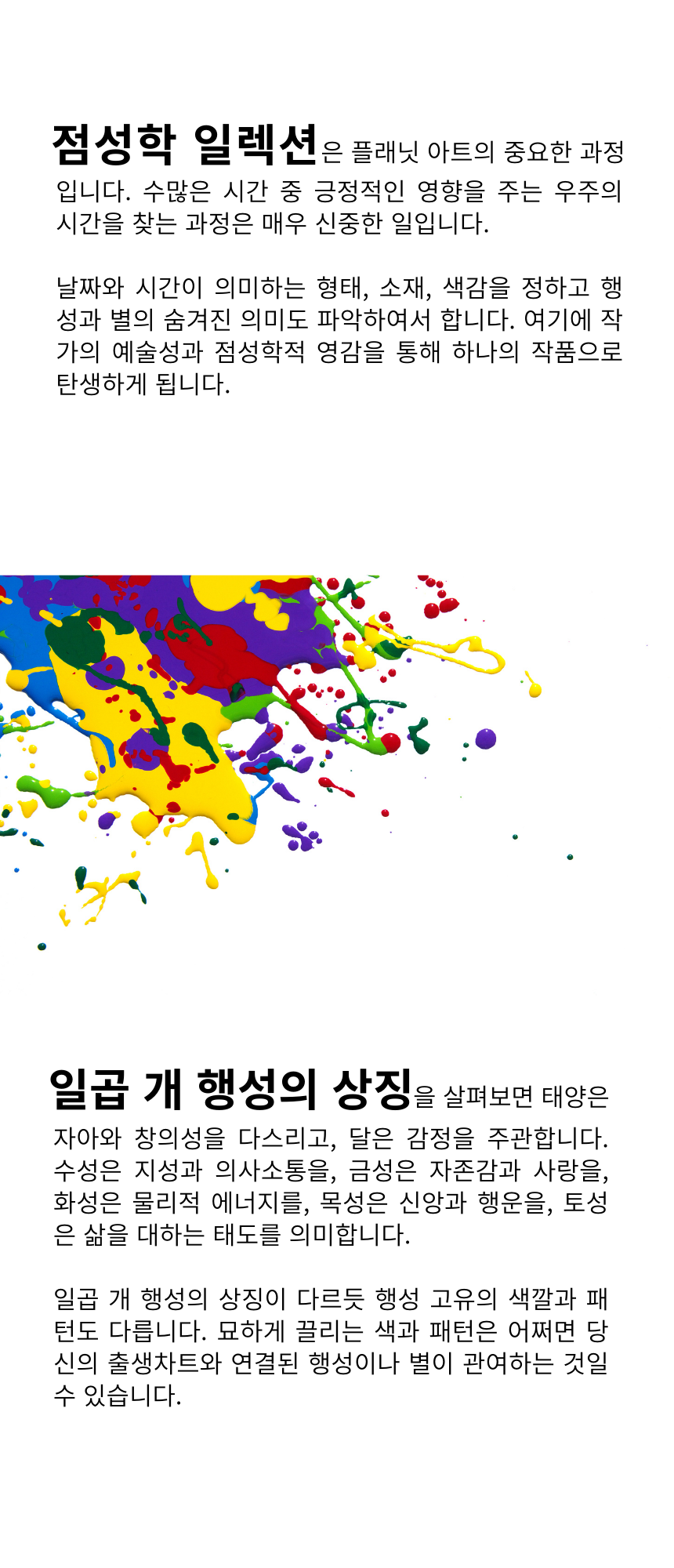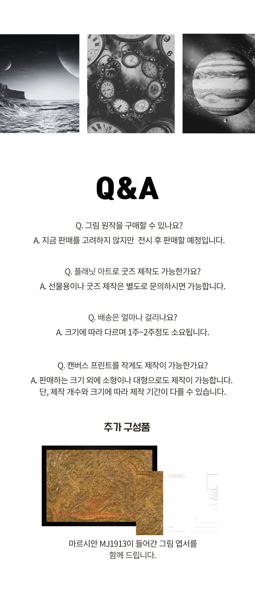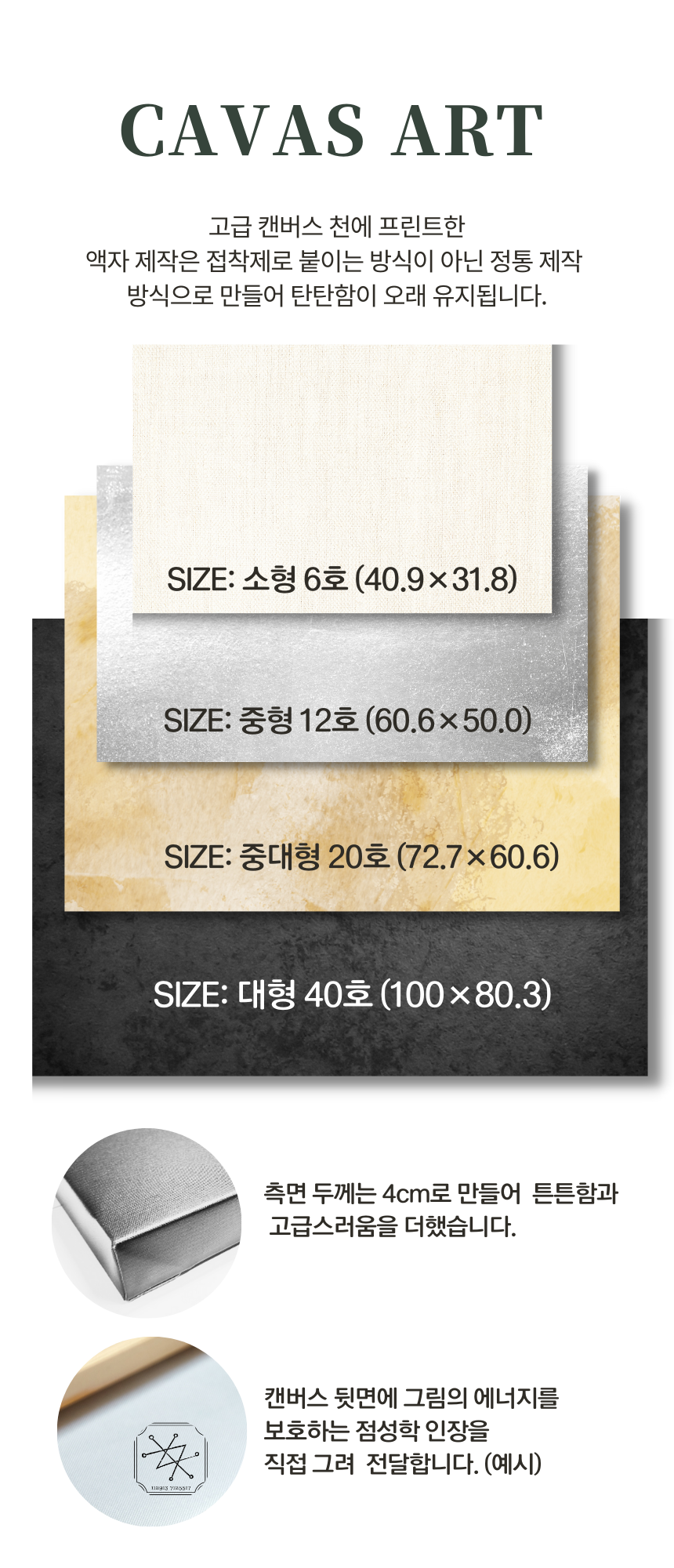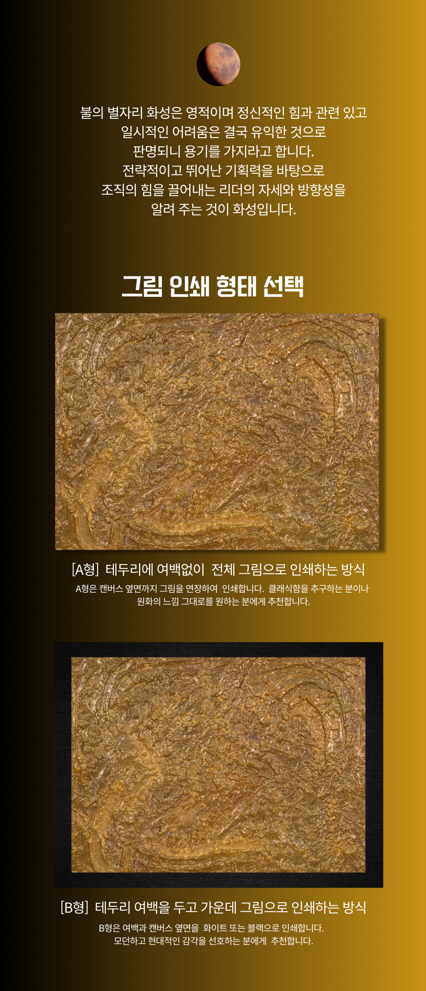영국점성학연구소 강성원 소장이 직접 그린 그림을 캔버스에 인쇄하는 주문 제작 상품입니다. 화성의 긍정적인 영향을 준 시간에 그린 그림으로 유화와 레진, 운석가루로 화성의 거친면을 표현했습니다. 캔버스 액자 뒷면에 소유자에게 도움이 되는 보호부 인장을 직접 그려 보냅니다.