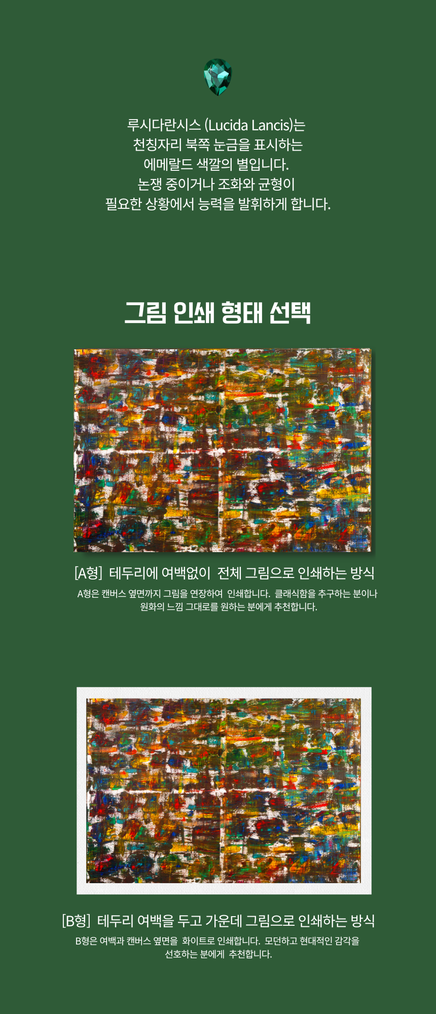 영국점성학연구소 강성원 소장이 직접 그린 그림을 캔버스에 인쇄하는 주문 제작 상품입니다. 루시다란시스 별과 태양, 화성이 긍정적인 영향을 준 시간에 그린 그림으로 캔버스 액자 뒷면에 소유자에게 도움이 되는 보호부 인장을 직접 그려 보냅니다.